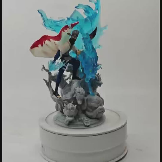 Symbole de puissance et de sagesse, cette figurine capture un guerrier légendaire maniant l’énergie du tonnerre et de l’esprit animal. Le loup translucide bleu illustre la fusion parfaite entre maîtrise spirituelle et puissance brute, tandis que le socle sculpté évoque un champ de bataille mystique.